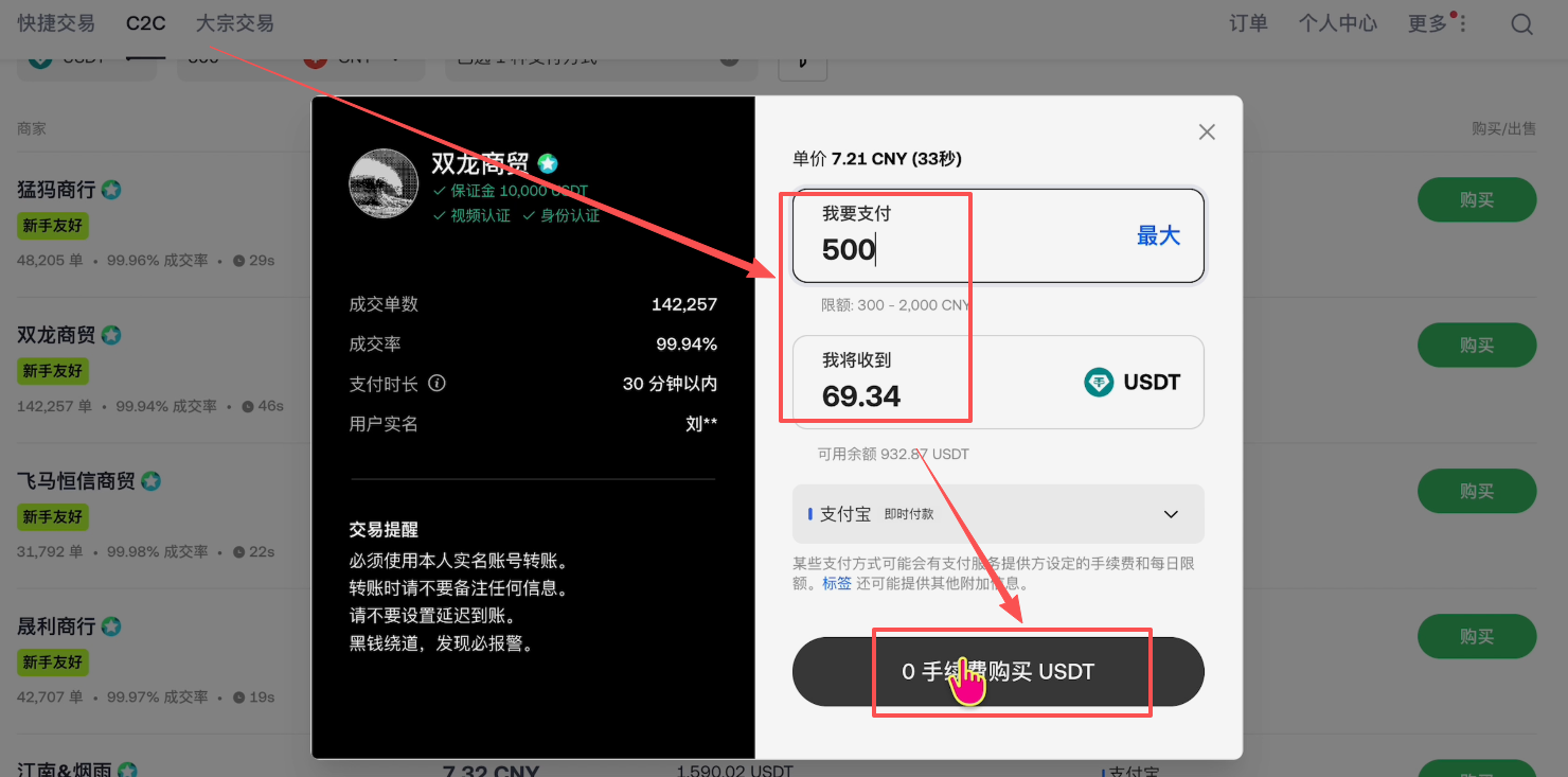再次输入一下要购买的金额,它会自动为我们算出来我们支付500人民币将收到69.34颗USDT,点击【0手续费购买USDT】。