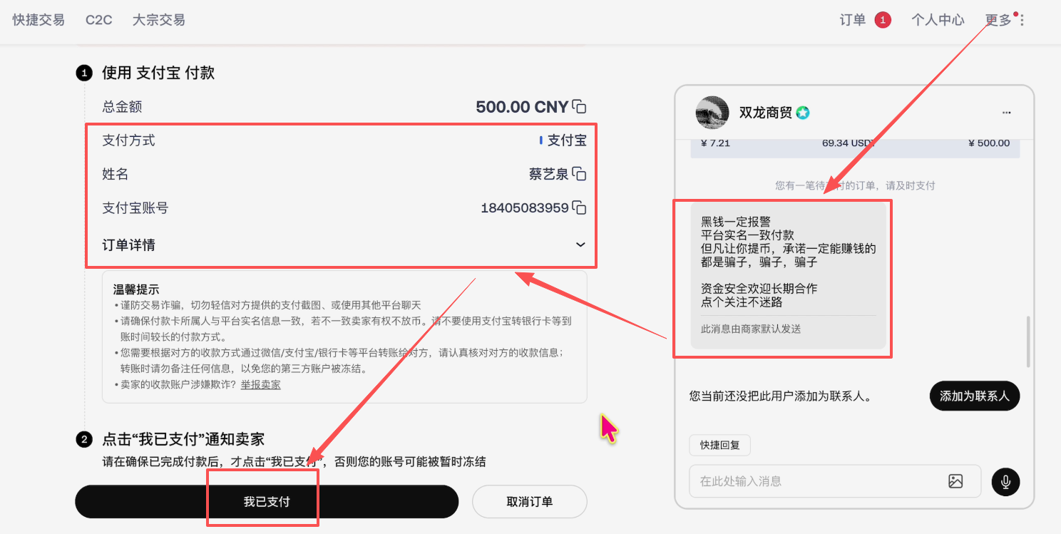 我们在右边聊天框这里看一下商家的要求,告诉我们一定要避免黑钱,黑钱的话商家会报警的,平台必须要实名一致付款。然后我们根据商家提供的支付方式给对方转钱,转完钱之后点击【我已支付】,等待卖家核实收到钱之后,就会把币打给我们了。