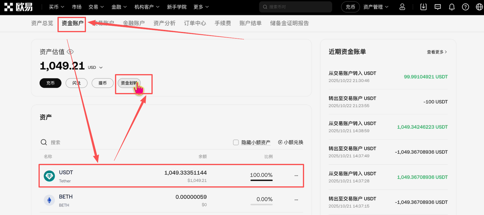 选择“资金账户”,在这里就可以看到我们购买好的USDT了。我们有了USDT之后就可以去买XAUT的黄金代币了。这时候我们需要先进行资金划转。