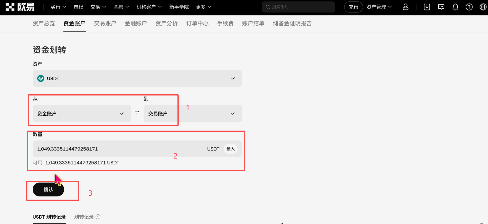 将我们的钱划转到交易账户,全部划转,点击【确认】。