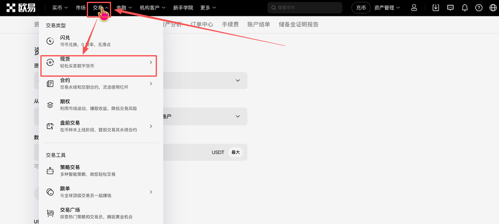 划转好之后我们就可以去购买XAUT黄金代币了。在上方选择【交易】,选择【现货】交易,