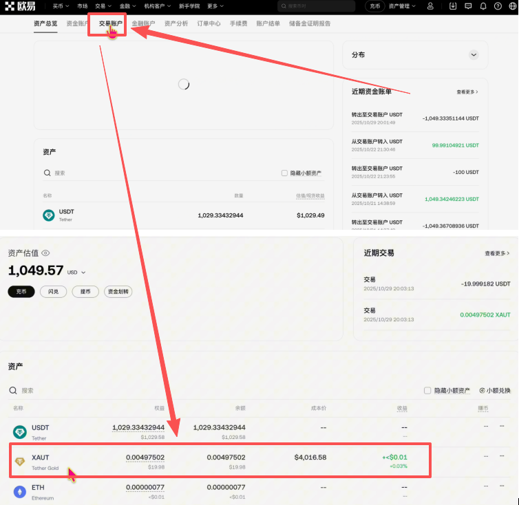 上方我们选择【交易账户】,下方这里就可以看到我们刚才购买好的XAUT黄金代币了。