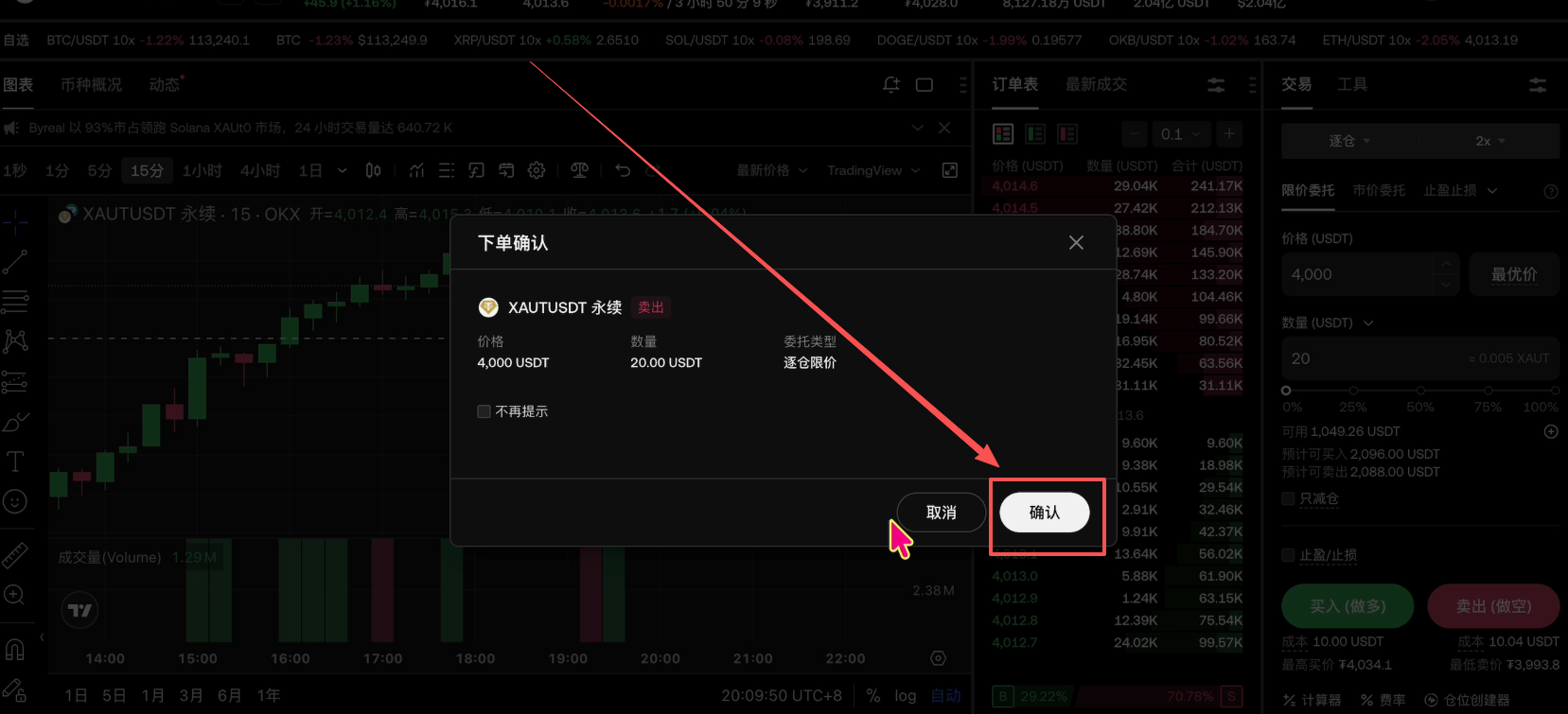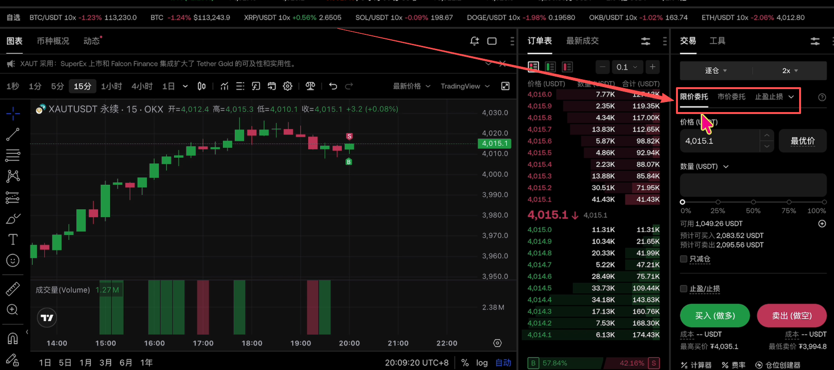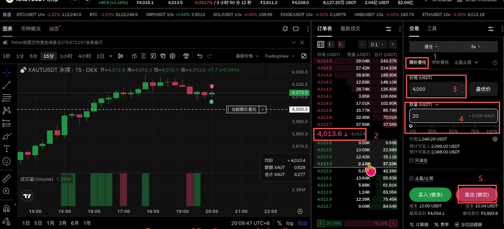 比如说这里我想使用限价委托,它现在的价格是4015,我想要在4000的时候来进行购买。设置好之后,在设置一下要购买的数量,然后点击买入做多或者是卖出做空。如果你想要做空XAUT就点击【卖出做空】。