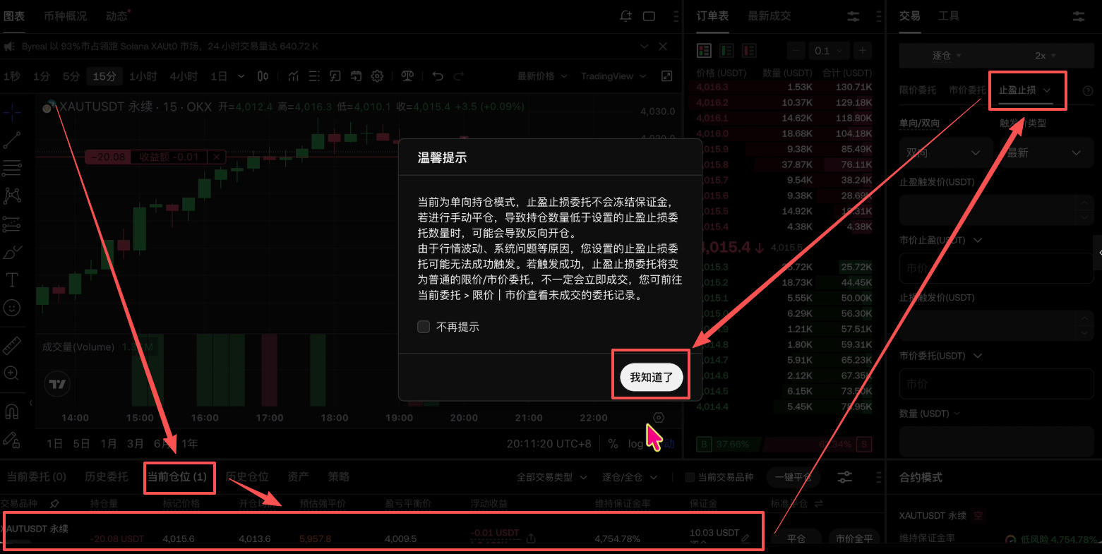 在下方【当前仓位】这里,就可以看到我们开好的这个空单了。如果你不想一直盯着,可以在这个单子的基础上设置止盈止损。点击上方的【止盈止损】,你可以在这里进行设置。