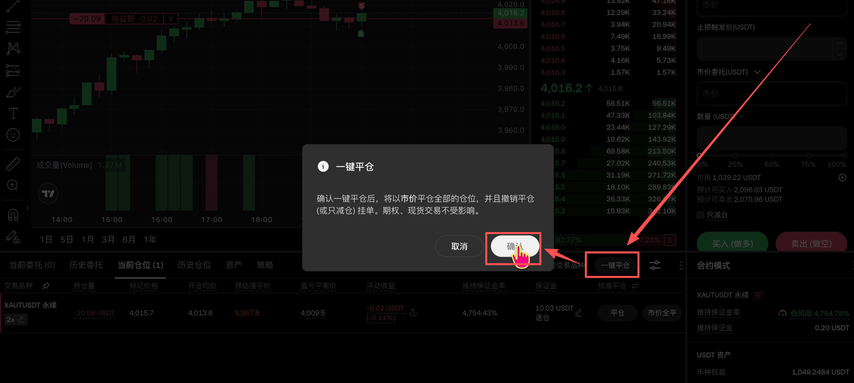 如果你不想玩了就可以点击这里的【一键平仓】,再点击【确认】,这样就把我们的单子给平掉了。