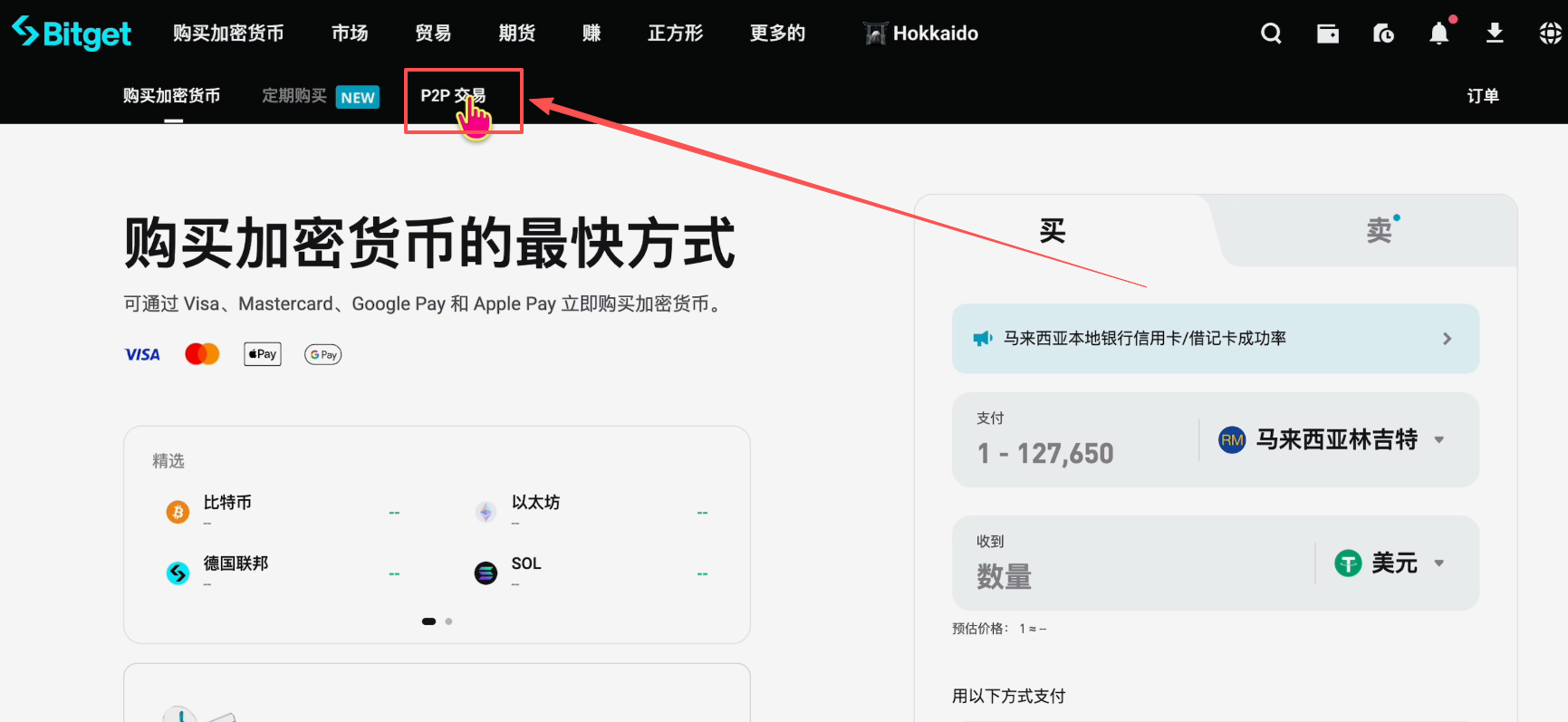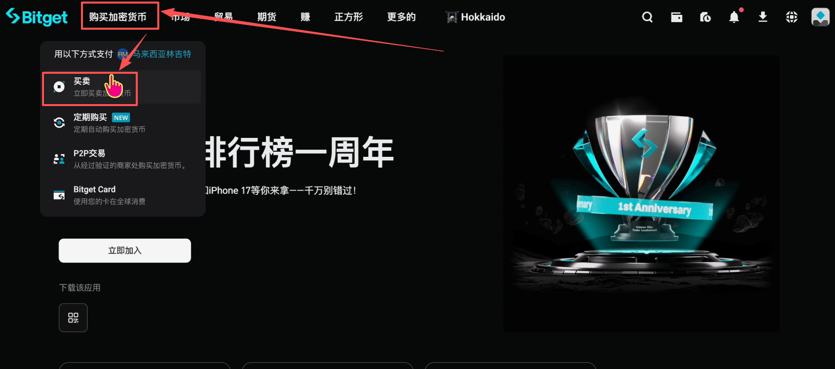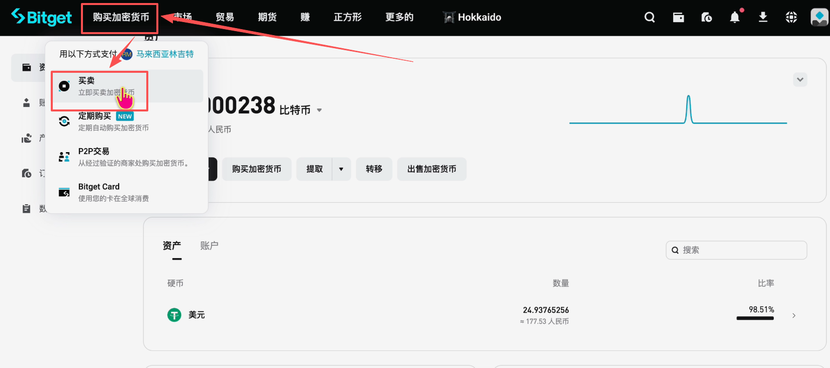 注册完成之后,我们进入到Bitget交易所的首页,点击左上角“购买加密货币”,选择【买卖】。