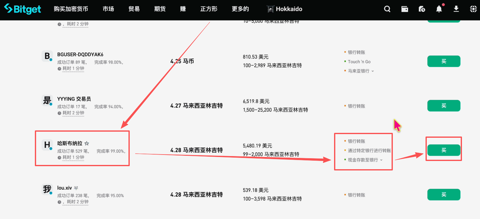 然后我们要找成单量和完成率高的商家来进行购买。比如说“哈斯布纳拉”这一家,订单是有529笔,完成率在99%,这家就蛮高的,我们就可以跟这家来进行购买。后面支持我们使用银行卡,现金存款至银行的方法来记性购买。你点击【买】之后,根据商家提供的支付方式给对方转钱。转完钱之后,我们就等待卖家核实收到钱之后就会把币打给我们了。