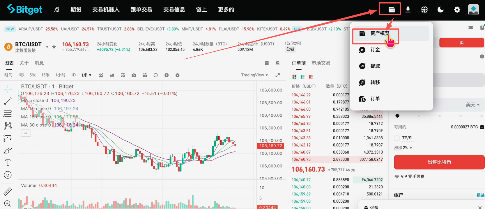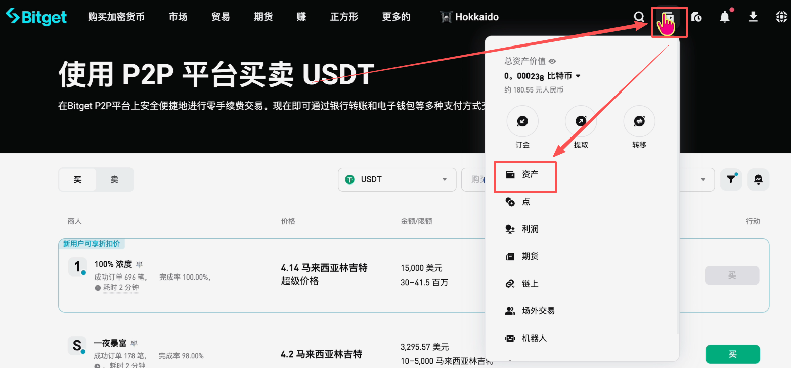 我们买好的USDT都会在资金账户里面,你在上方点击钱包按钮,找到【资产】。