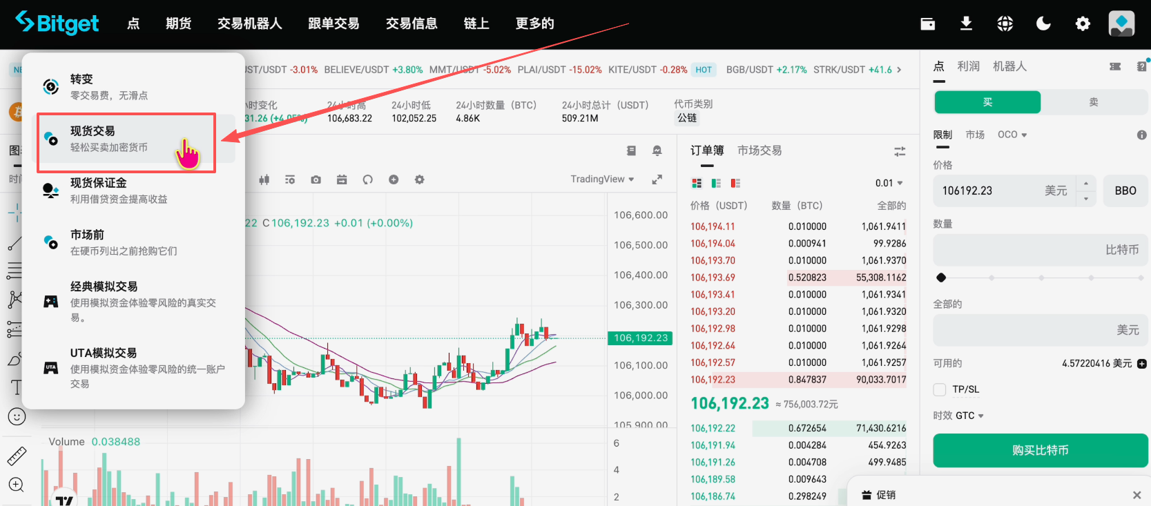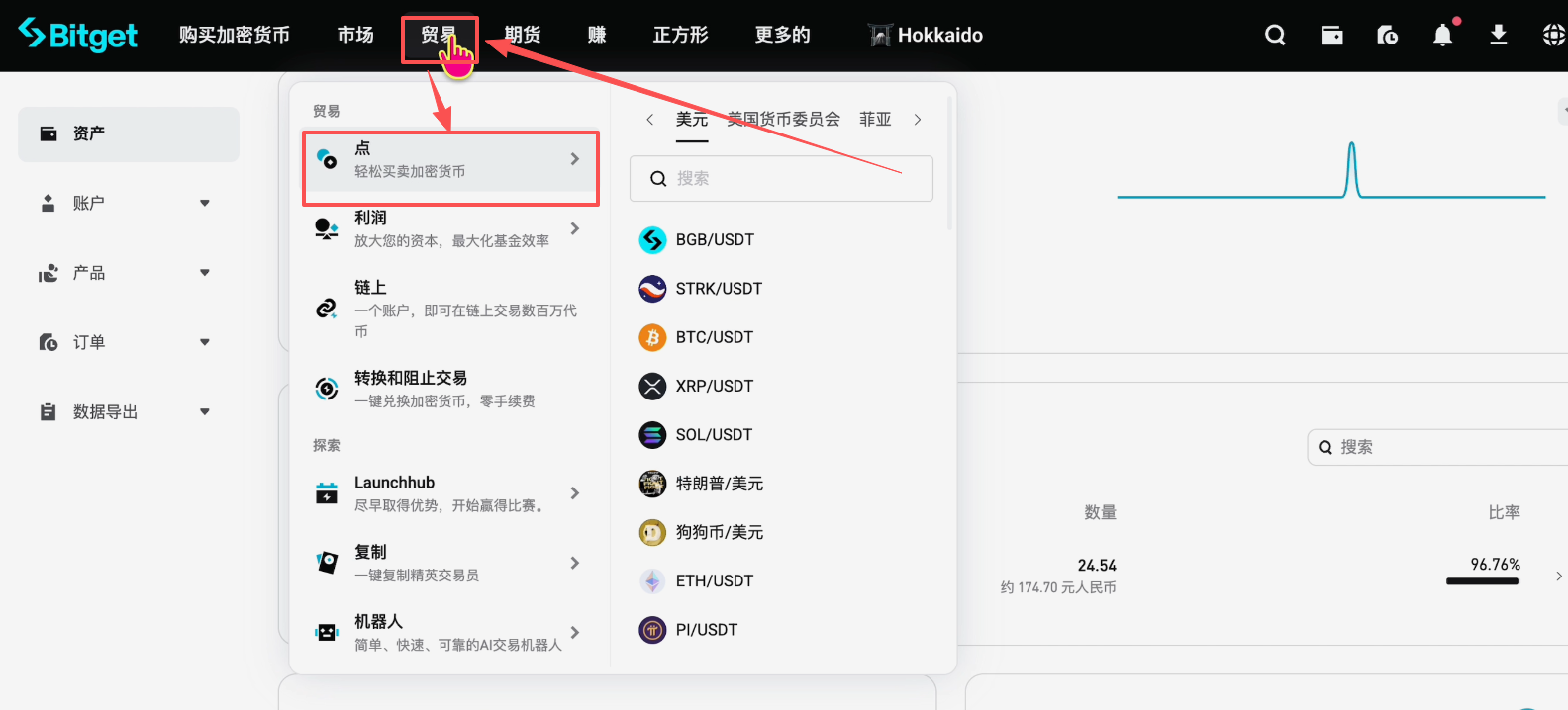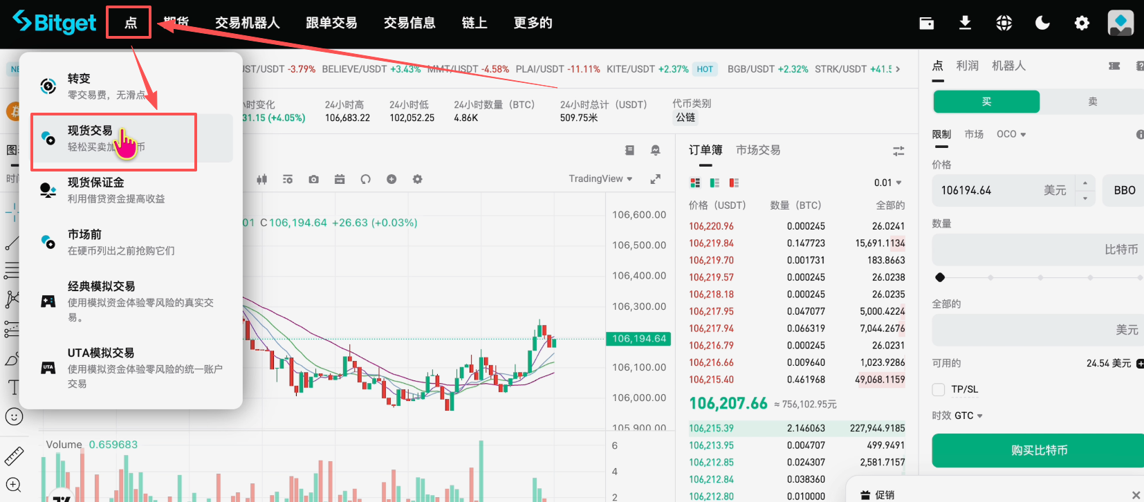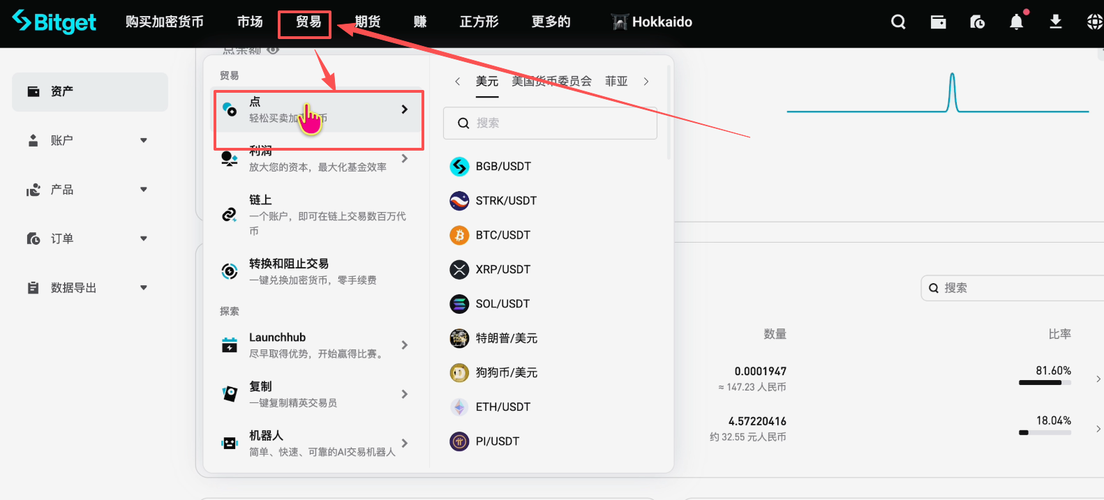 当我们有了USDT之后就可以来买卖比特币了。这个时候我们在上方点击【贸易】,再点击【点】。