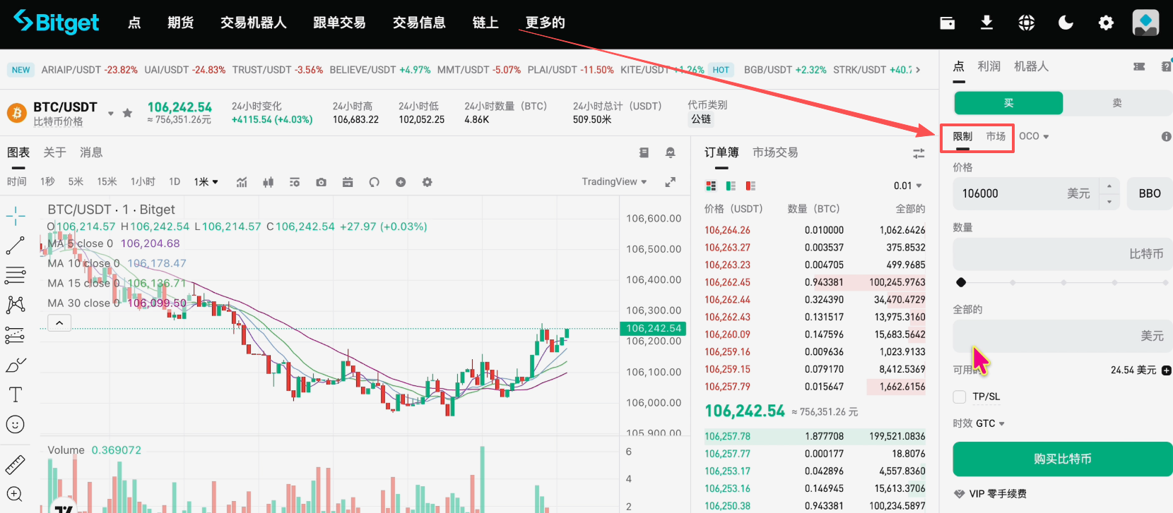 回到右边这里,这里有“限制”和“市场”。“限制”就是你可以设置一个价格,当达到那个价格的时候才能够成交,当然这个是需要我们去等的。“市场”价格就是它会以当前市场最优惠的价格直接成交。
