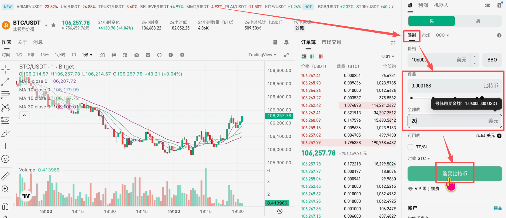 比如说我使用“限制”。然后在这里输入你要购买的数量或者是金额,比如说我这里输入20,点击【购买比特币】。
