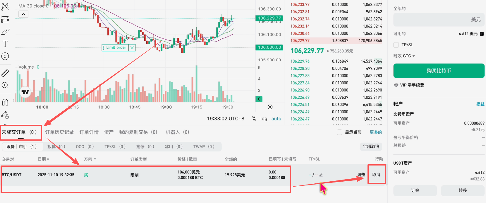 然后我们往下倒,在下方“未成交订单”这里就可以看到我们刚才以限价购买好的比特币的订单了,它还没有成交。如果你想要立刻进行购买,就可以把这个取消掉,点击【取消】。大家注意挂单以及撤单如果不成交的话,是不收取任何手续费的。