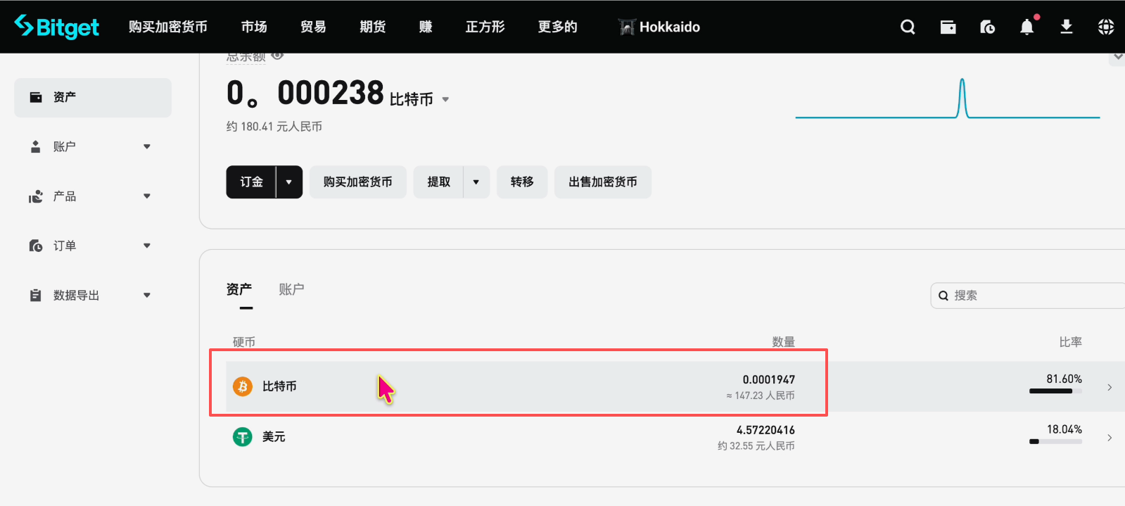 我们还是回到资产,在你的资产里面就可以看到你刚才购买好的比特币了。