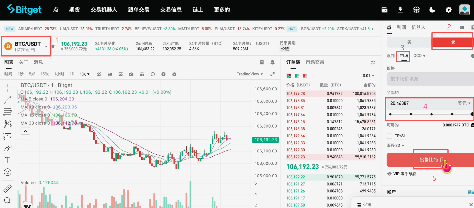 还是选择BTC/USDT的交易对。这时候我们在右边选择【卖】。他还是有限价单和市价单,我们就直接使用市价单,因为可以快速成交。输入金额,点击【卖出比特币】。