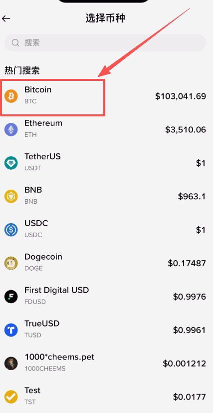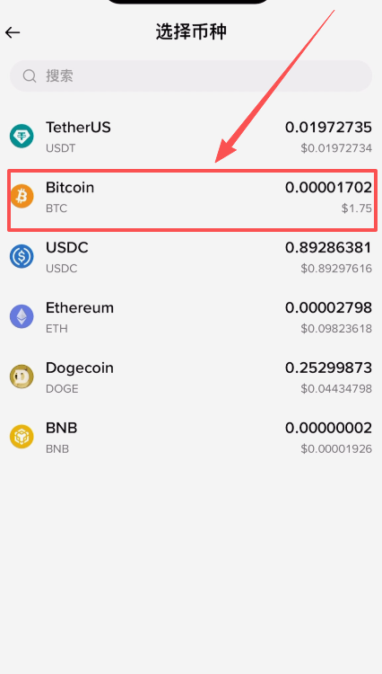 然后选择我们想要购买的币种,比如说比特币。