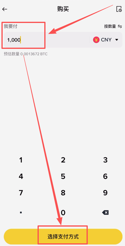 输入购买比特币的数量或者是购买金额,要注意下方是有购买限额的。比如说这里我就购买1000人民币的USDT,然后点击【选择支付方式】。