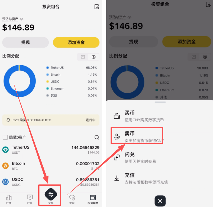 我们还是点击底部的【交易】按钮,选择【卖币】。