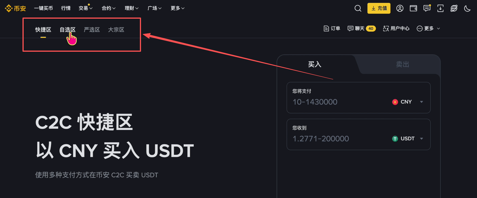 这里有快捷区、自选区还有严选区、大宗去。我们就使用“自选区”,也就是个人对个人交易。