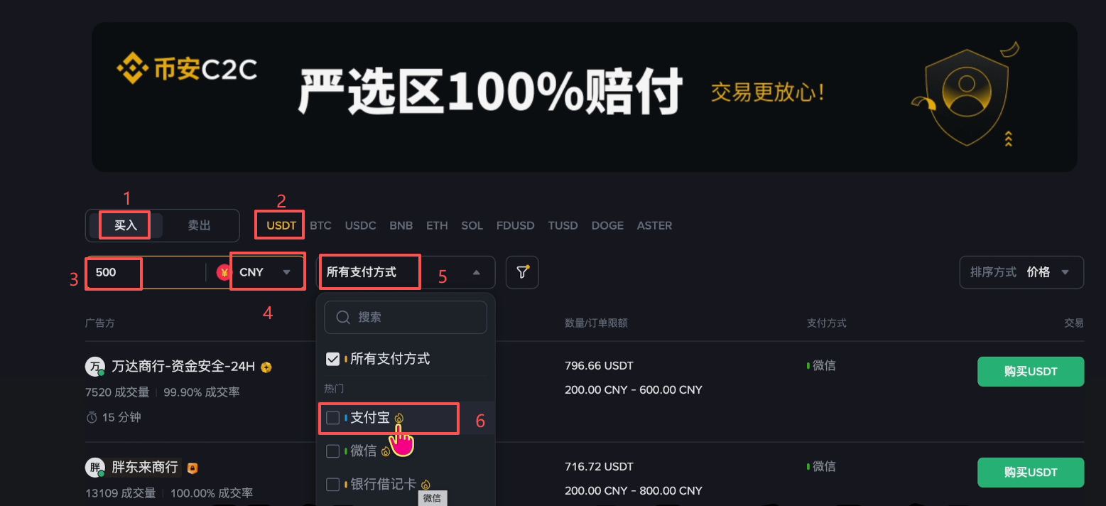 然后你可以筛选一下要购买的金额,比如说我想要购买500人民币的USDT就输入500。后面的“CNY”就是人民币的意思,就是我们要使用的法币。这里还可以选择支付方式,有支付宝、微信、银行借记卡还有QQ钱包,你习惯使用哪种方式支付就使用哪种方式支付。比如说我习惯使用支付宝,我就勾选“支付宝”。