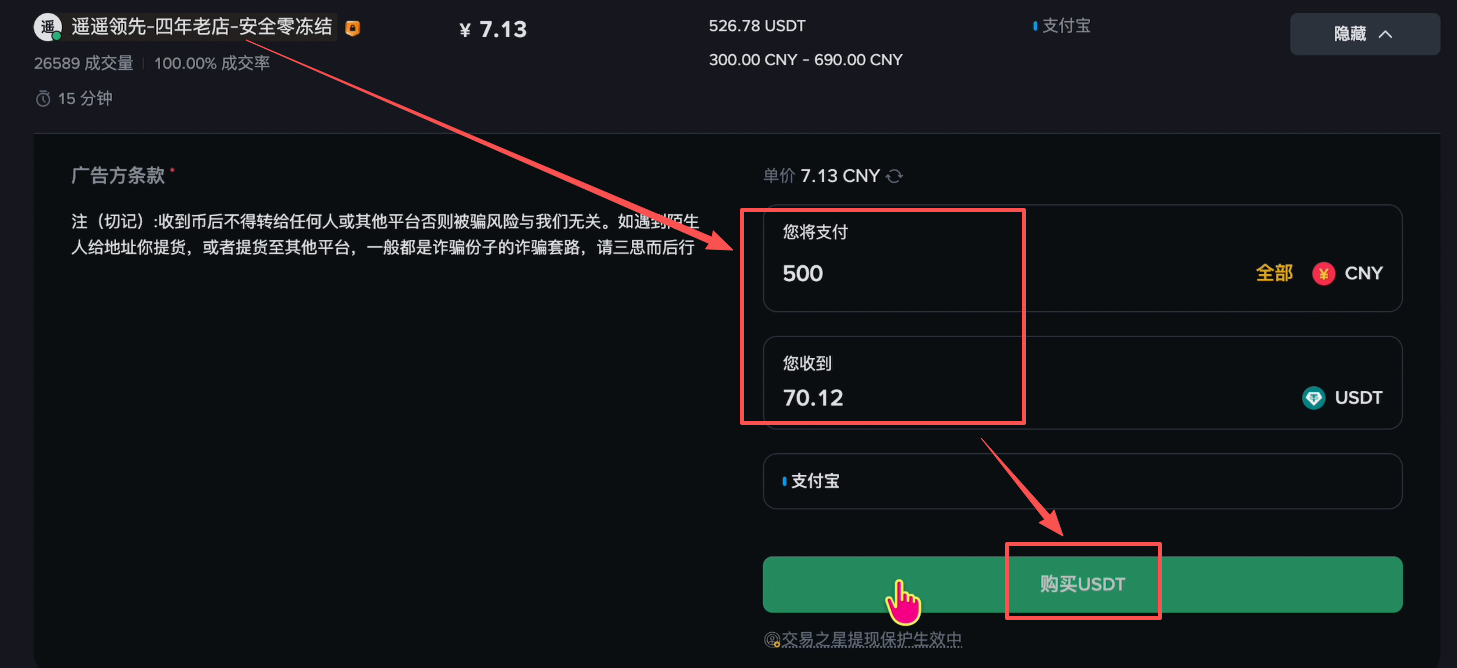 再次输入一下你要购买的金额,它会自动为我们算出来,我们支付500人民币将收到70.12颗USDT。点击下方的【购买USDT】。