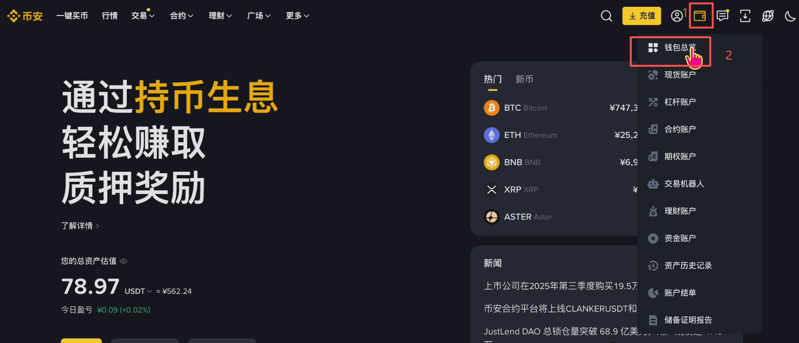 我们买好的USDT都会在资金账户里面,你可以点击上方的小钱包,找到【钱包总览】。