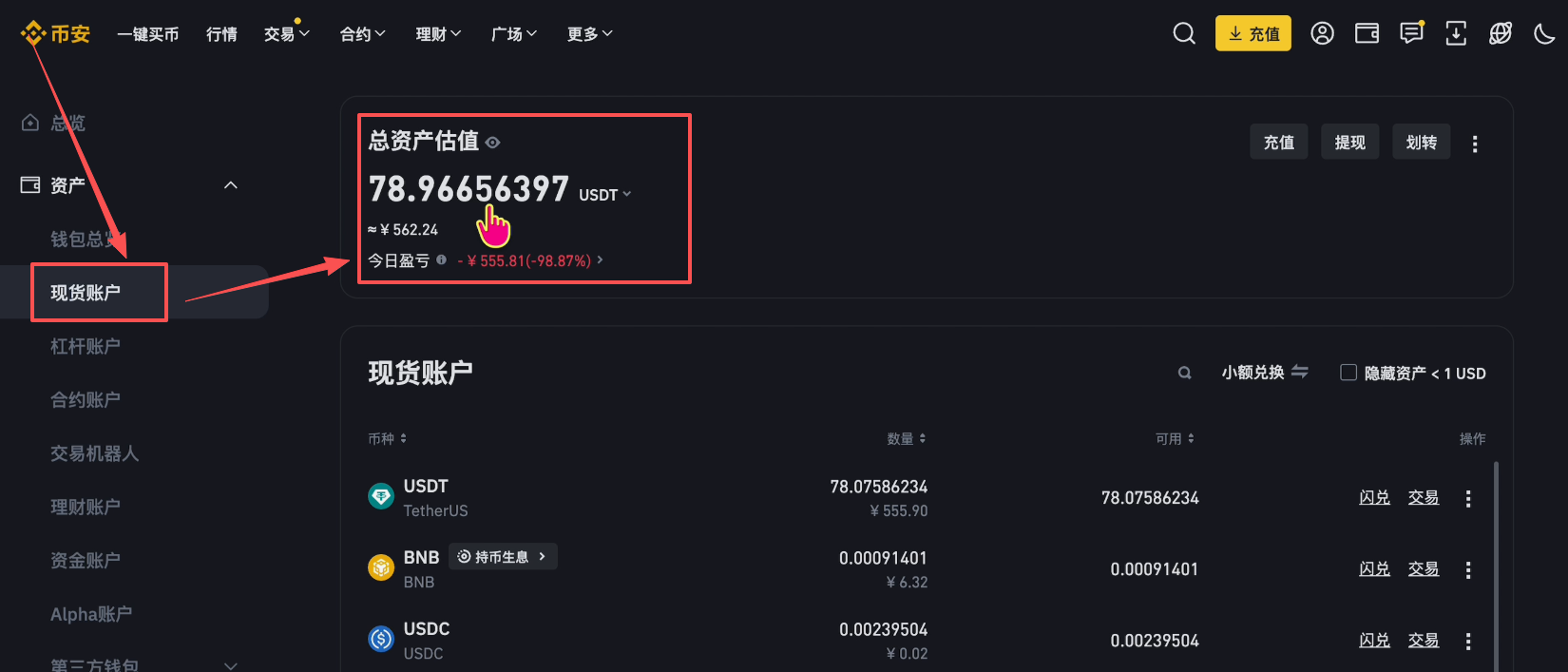 划转成功之后我们再去到现货账户,可以看到我们的钱已经划转到现货账户了。把资金划转到现货账户之后就可以去交易其他的虚拟货币了。