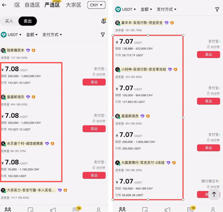 然后我们来看一下如何去筛选这些商家。首先你可以看到其实他有不同的报价,目前能给到最高的价格是7.08,下面还有7.07,。我们就尽量去选择7.07的报价,不去选择7.08的报价。因为过高的报价难免一些别有用心的可能,所以我们就选择报价次之的7.07,在这些商家里面去选。