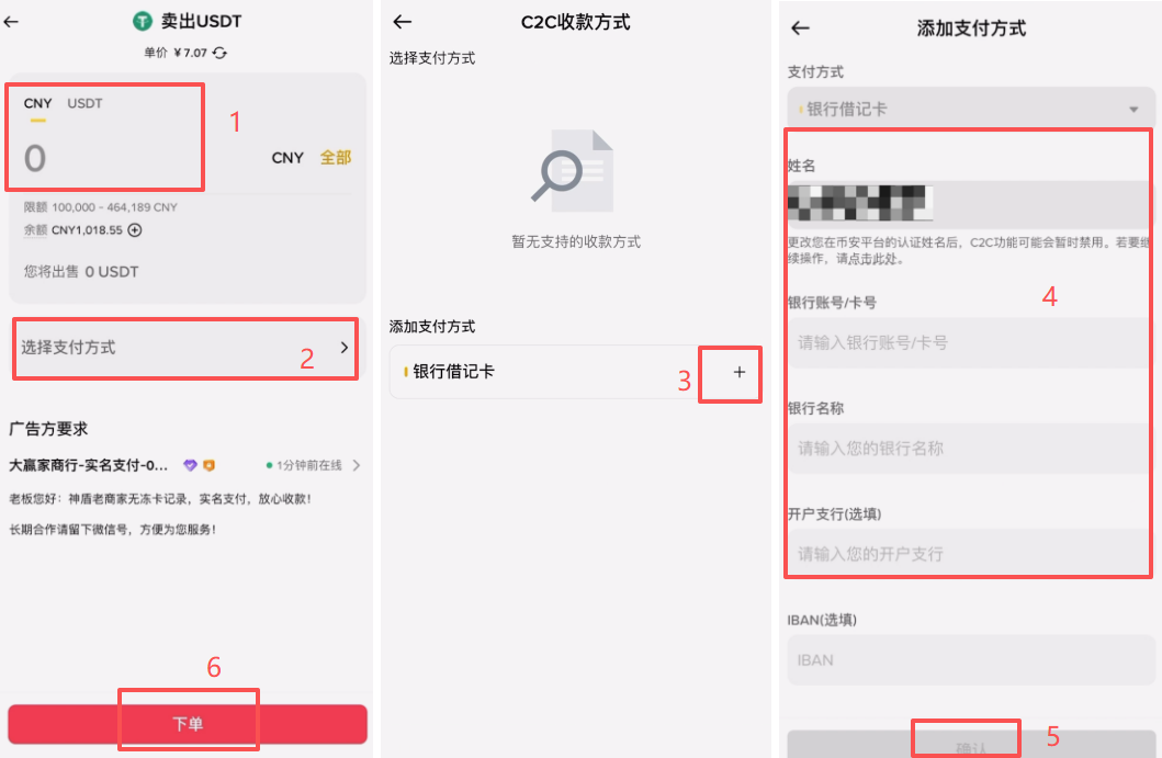 这里你可以选择按金额出售或者是按数量出售。按数量出售就是按USDT的数量出售,按金额出售就是按人民币的金额出售。我们直接去输入这个金额或者数量,然后去选择我们的收款方式,在这里就可以去添加上我们的收款方式,点击+号,输入我们的信息,点击【确认】。添加好之后再点击【下单】。