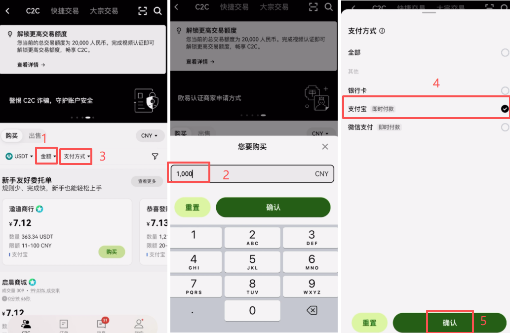 首先可以筛选一下我们要购买的金额,比如说我想购买1000人民币的USDT,然后筛选一下支付方式,比如说我们选择“支付宝”,点击【确认】。