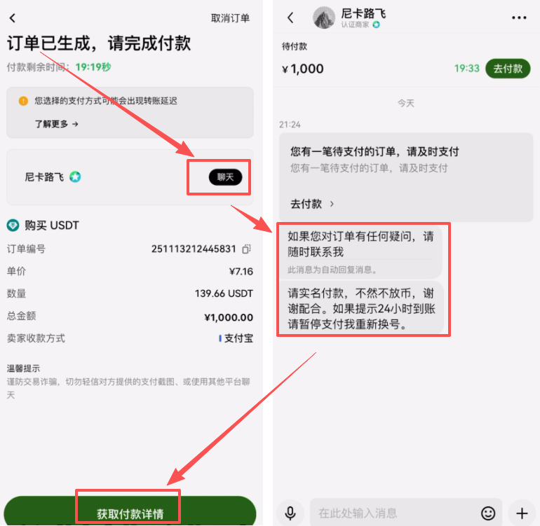 现在我们的订单就生成了,我们可以点击【聊天】这里,看一下卖家有哪些要求,比如说实名付款。想要让交易顺利的进行,我们就必须按照商家的要求去做,这也是为了我们买卖双方的资产安全。确认这个订单没有问题之后,我们就点击【获取付款详情】。