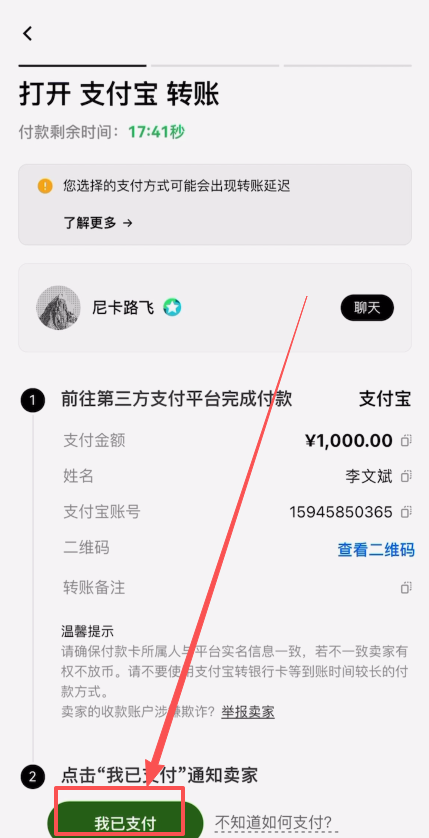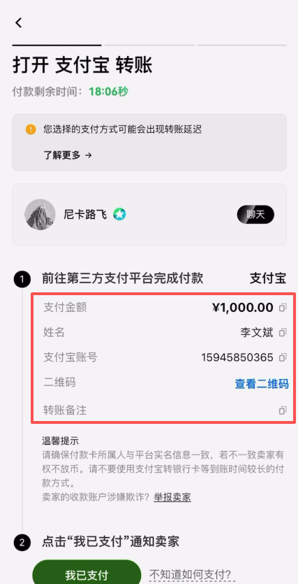 这个时候商家的姓名,还有他的支付宝账号和收款二维码,都会显示出来。需要我们离开平台去到支付宝里面,根据卖家提供的信息去给他转账。有一些商家可能会有一些查流水的要求,如果你觉得麻烦也可以取消订单去换一个商家去交易。