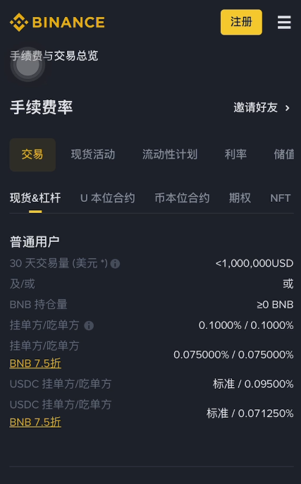 然后我再来说一下手续费。手续费和物理世界买卖基金、股票一样,成交就会被扣手续费。币安现货交易手续费由用户等级而定,最高为0.1%。又看你是吃单还是挂单的一方,数值略有差异。
