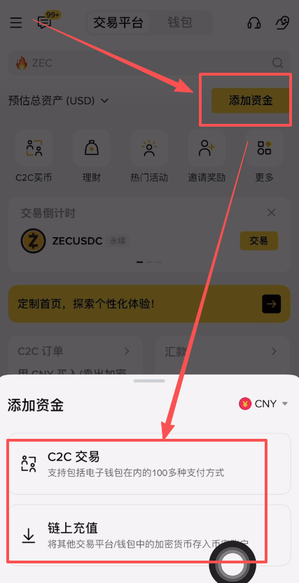我们可以在币安的首页,点击上方的【添加资金】。可以看到有C2C交易和链上充值,我们可以通过这两种方式来给大家进行入金。入金的教程,我的往期文章都有演示过,大家可以去看一下。