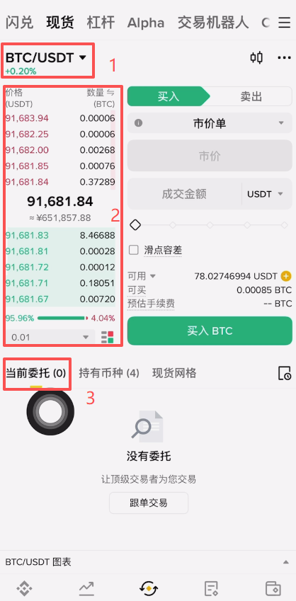 我们在上方这里可以搜索想要交易的币对,比如说我想要购买比特币就可以直接搜索“BTC”,选择“BTC/USDT”。就是我们使用USDT去兑换比特币。