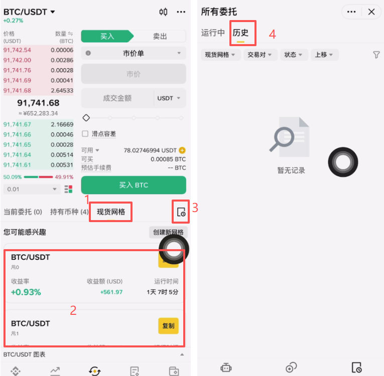 还有“现货网格”,我们在这里可以进行网格操作。旁边小本子标志的地方就是我们的历史成交记录,我们的历史成交记录就在这里查找。