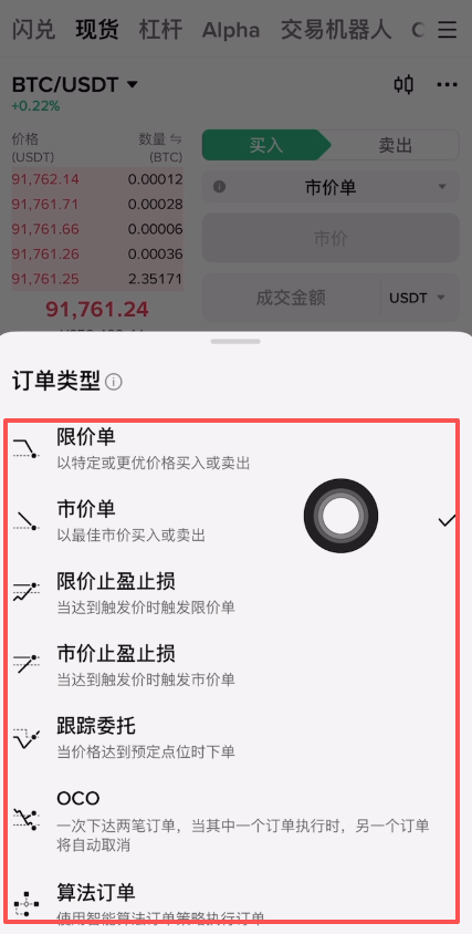 另外币安还提供了多种订单方式,分别有限价单、市价单、限价止盈止损、市价止盈止损还有跟踪委托单、OCO、算法订单。它下面都给我们介绍好是什么意思了。