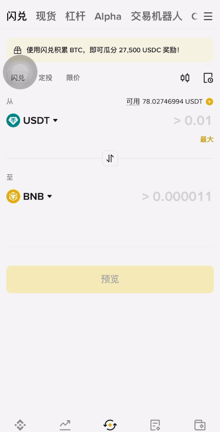 除了挂单买卖,币安还提供了闪兑功能,快速换币无需等待。虽然报价略差但胜在便利。
