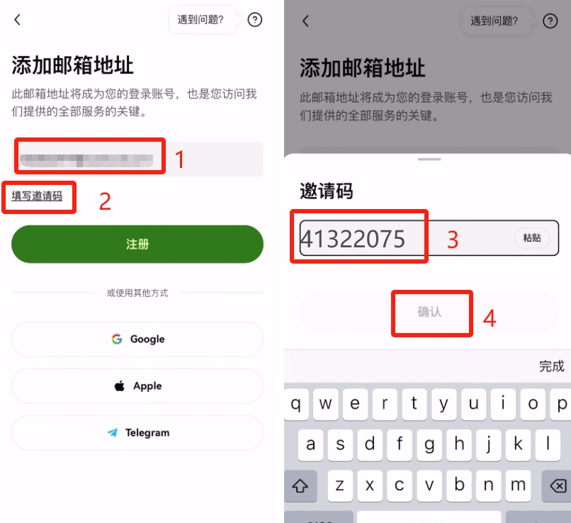 这时候就需要我们输入进我们的邮箱地址来进行注册。下方有个填写邀请码的部分,我们点击。在这里面输入进41322075,点击【确认】。