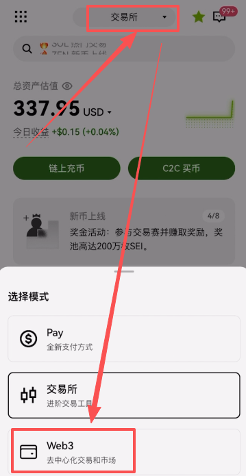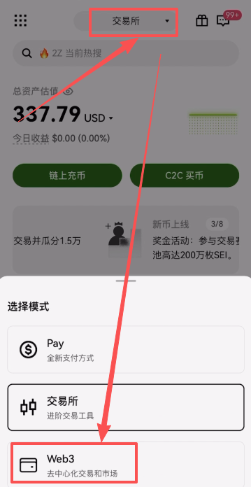 我们回到欧易的首页,下一步就是去创建我们的欧易Web3钱包。我们点击最上方更换模式,选择“Web3”。