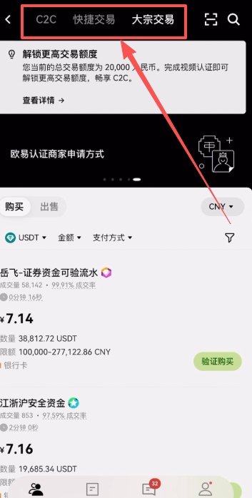 这里有C2C、快捷交易以及大宗交易。大宗交易和C2C还是比较类似的,只不过大宗交易它一般是针对于大额的交易,而C2C是我们根据自己的要求,自行去筛选一个商家,安全性会更加的高。
