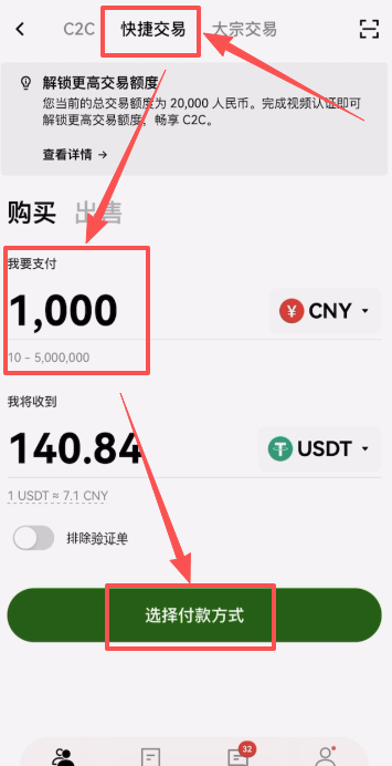 因此我们出金的时候一般都选择C2C,入金我们使用快捷交易就可以了,会更加的方便快捷。这里直接输入我们想要购买的人民币的数量,比如说我这里想买1000人民币的USDT,然后点击【选择付款方式】。