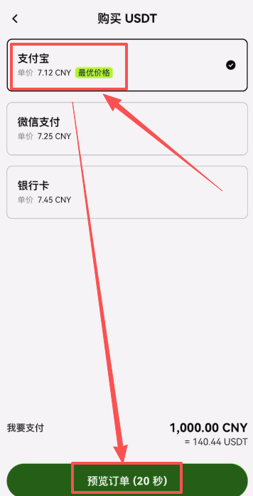 你可以选择支付宝、微信和银行卡。这里我就选择价格最优的支付宝,然后点击【预览订单】。