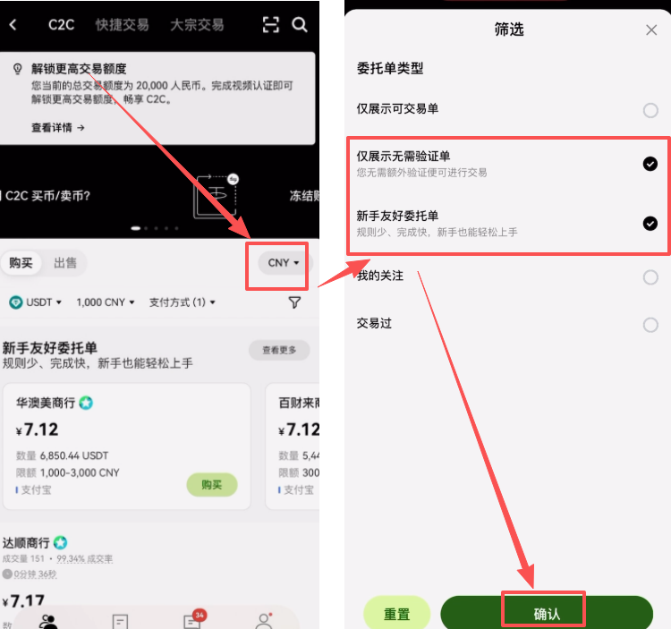 当然如果你想自己去筛选一个比较靠谱的商家也是可以的,我们来到“C2C”。在“购买”的页面,下方的金额这里面我们可以筛选,比如说我这里购买1000人民币的USDT,支付方式这里我选择使用“支付宝”,点击【确认】。