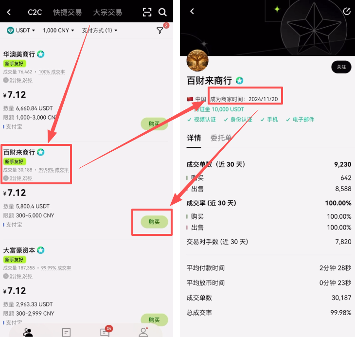 这样下面这些商家都是对我们新手比较友好的,以及在我们交易的时候不需要有一些比较复杂的自证流程。我们就去选择一个成交量和成交率比较高的商家,然后点开他的主页,查看一下他成为商家的时间,越久越好,至少也得是1年半年的。因为这个商家他账户存活的时间越久,就证明他的资产越安全,交易这么长时间以来没有出现过什么问题,没有受到过什么风控。这样的商家我们就可以去放心的跟他交易了。确定跟他交易之后,我们点击右边这里的【购买】。