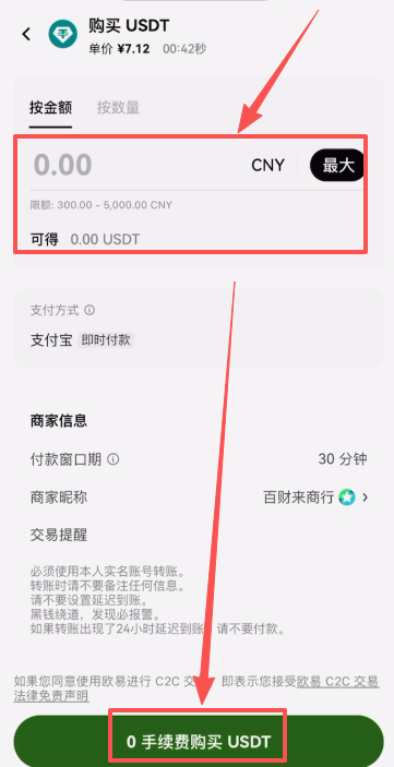 输入我们想要购买的金额或者是数量,然后点击【0手续费购买USDT】就可以了。