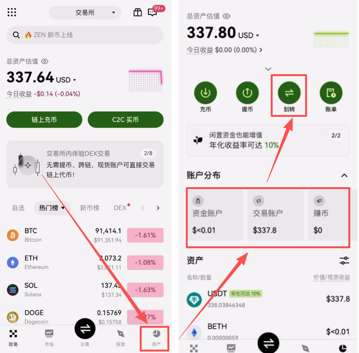 买完USDT之后,你需要点击右下角的【资产】,这里有三个账户,一个是资金账户,一个是交易账户,一个是赚币的账户。“资金账户”是专门针对于出入金的这么一个账户,“交易账户”是用来进行现货交易、合约交易等交易的账户。“赚币”是真么针对于理财的账户。我们购买好的USDT,它一般都是在资金账户里面,如果没有的话,我们就可以点击这里的【划转】。