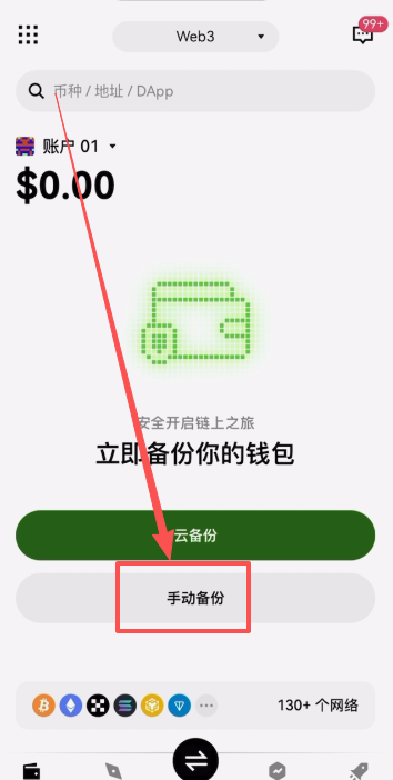 创建好之后还需要我们去把它备份一下,也就是说我们要把钱包的私钥,单独的给它备份出来,这样会更加的安全。我们就点击这里的【手动备份】。