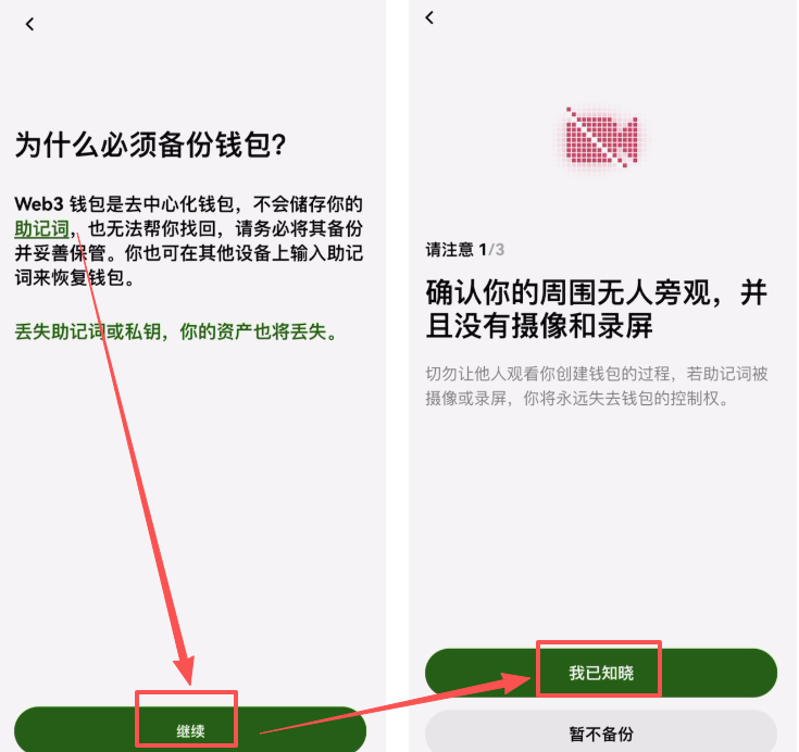 首先他会向我们说明,为什么要备份钱包。点击【继续】,再点击【我已知晓】。一定要看他的要求。