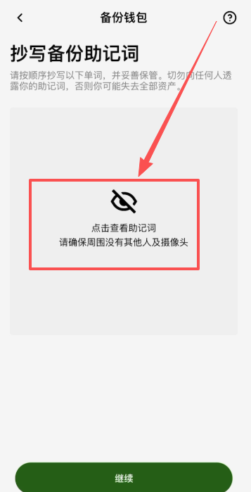 这个备份的内容其实就是助记词,这个是只能让我们自己知道的,千万不能保存到网上。截图拍照放到你的手机里绝对是不可以的,如果黑客偷了你的助记词或者是私钥,他就能够把你的钱包里面所有的钱都转走。最好的方法就是我们拿一张纸,手动的把它记下来。我们点击【查看】。