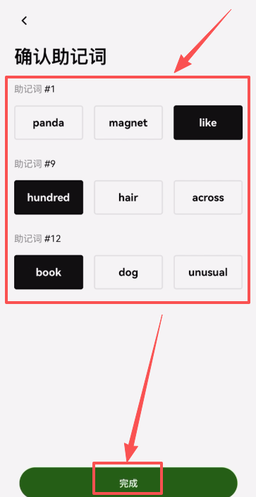 确认我们刚才记好的助记词,第一个是什么单词,第几个是什么单词。选好之后,点击【完成】。这样我们的钱包就备份好了。